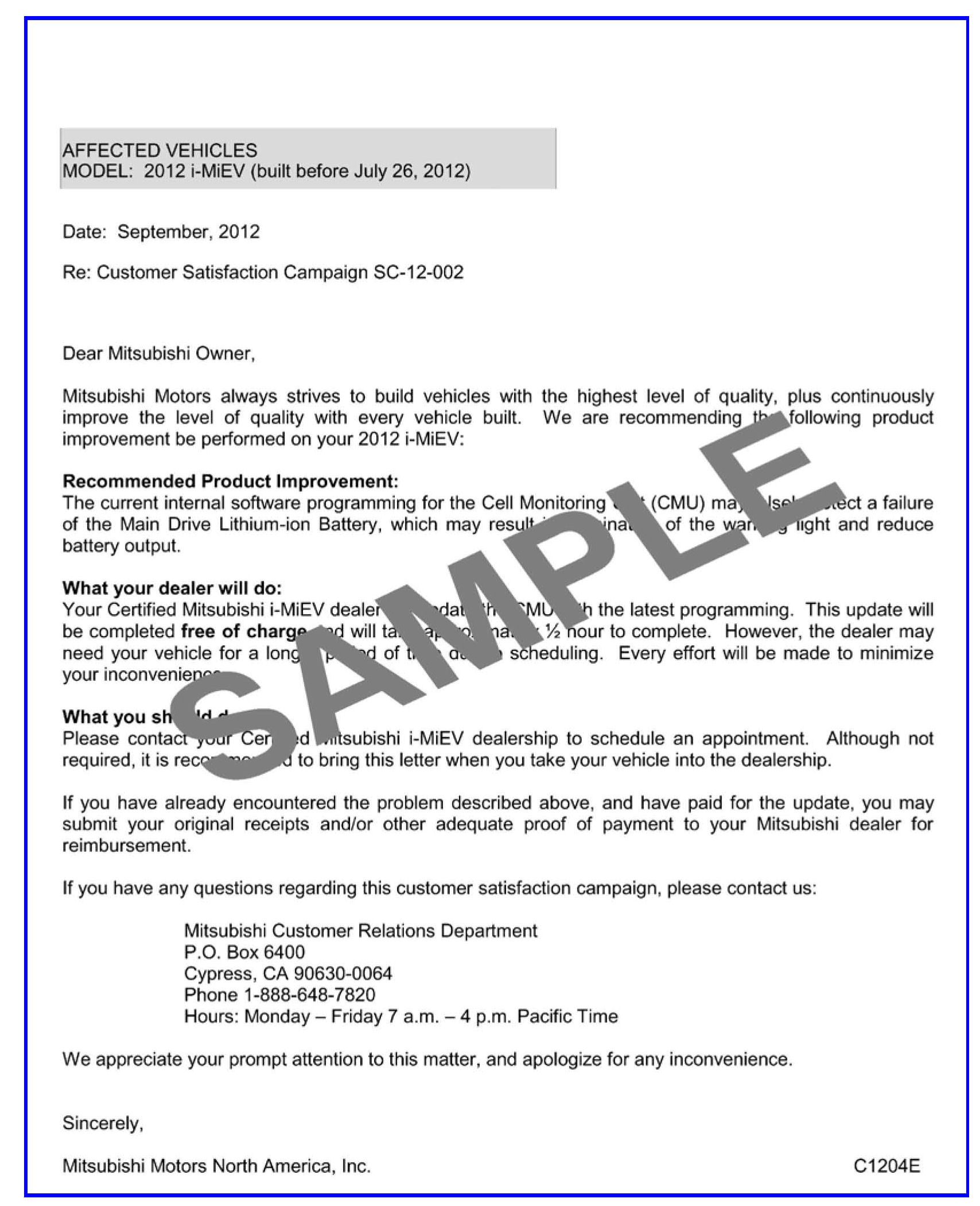 A letter will be sent to all owners of affected vehicles requesting them to bring their vehicle to a local certified Mitsubishi i-MiEV dealer to have their CMU updated to the latest software. A copy of the customer notification letter appears at the end of this bulletin.