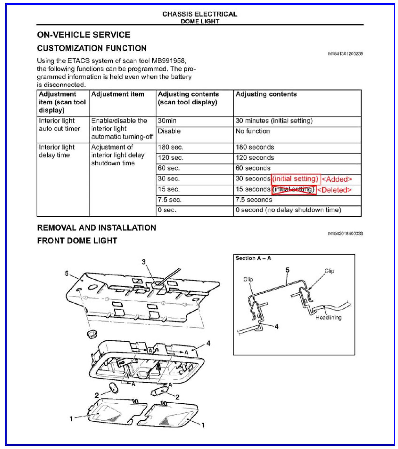 The initial customization settings for the interior light delay time is incorrect in the service manual. This TSB provides the updated information.