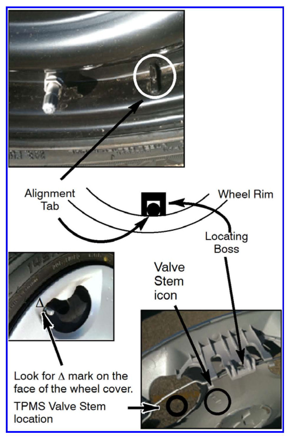 An alignment tab has been added to the wheel rim near the TPMS sensor valve stem. A corresponding locating boss on the wheel cover fits over the tab and ensures proper alignment.