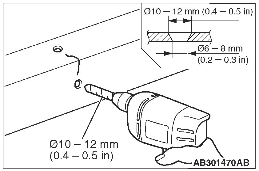 CAUTION: Be sure that the edges of the reinforcement plate are not near any place where a concentration of stress of the crossmember or spring hanger installation part, etc. could easily occur.
