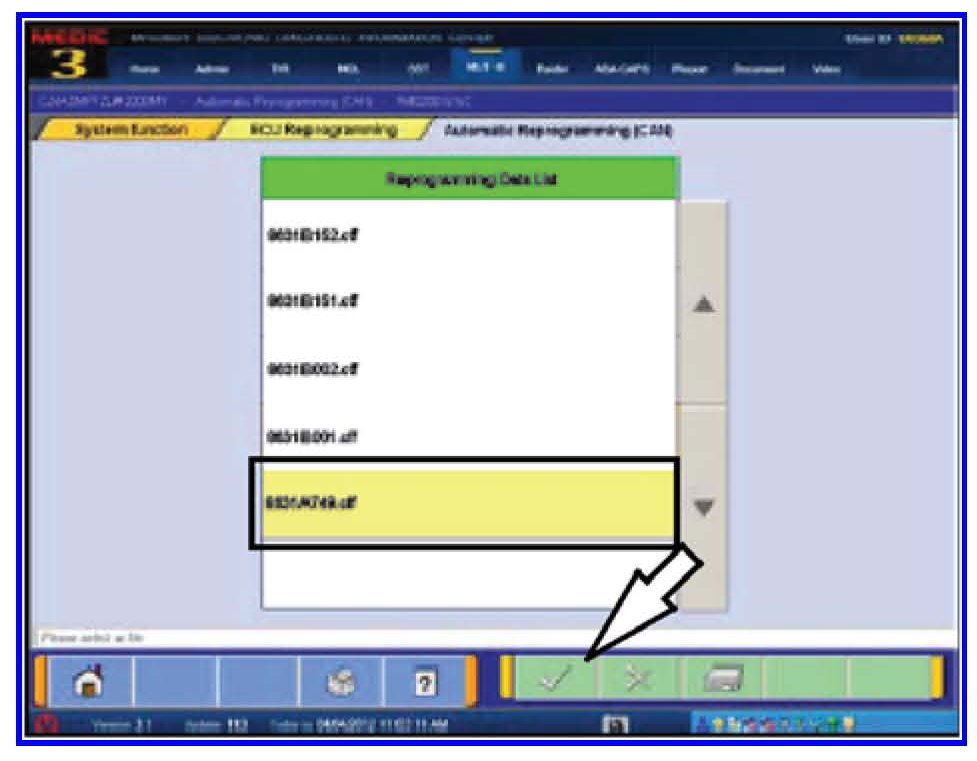 17. Select file 8631A749.cff from the Reprogramming Data List and click the check mark to continue.