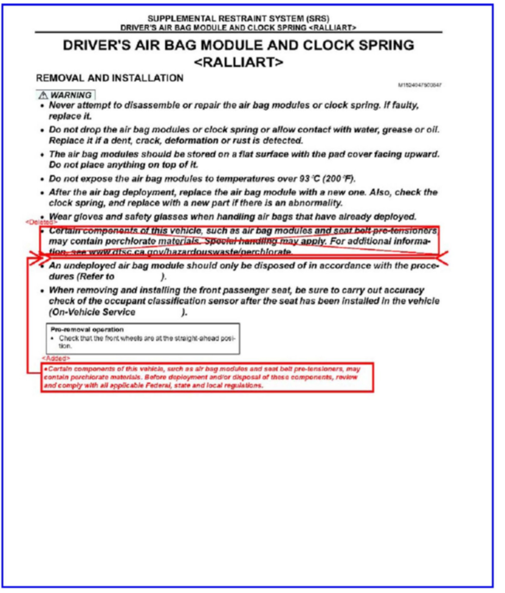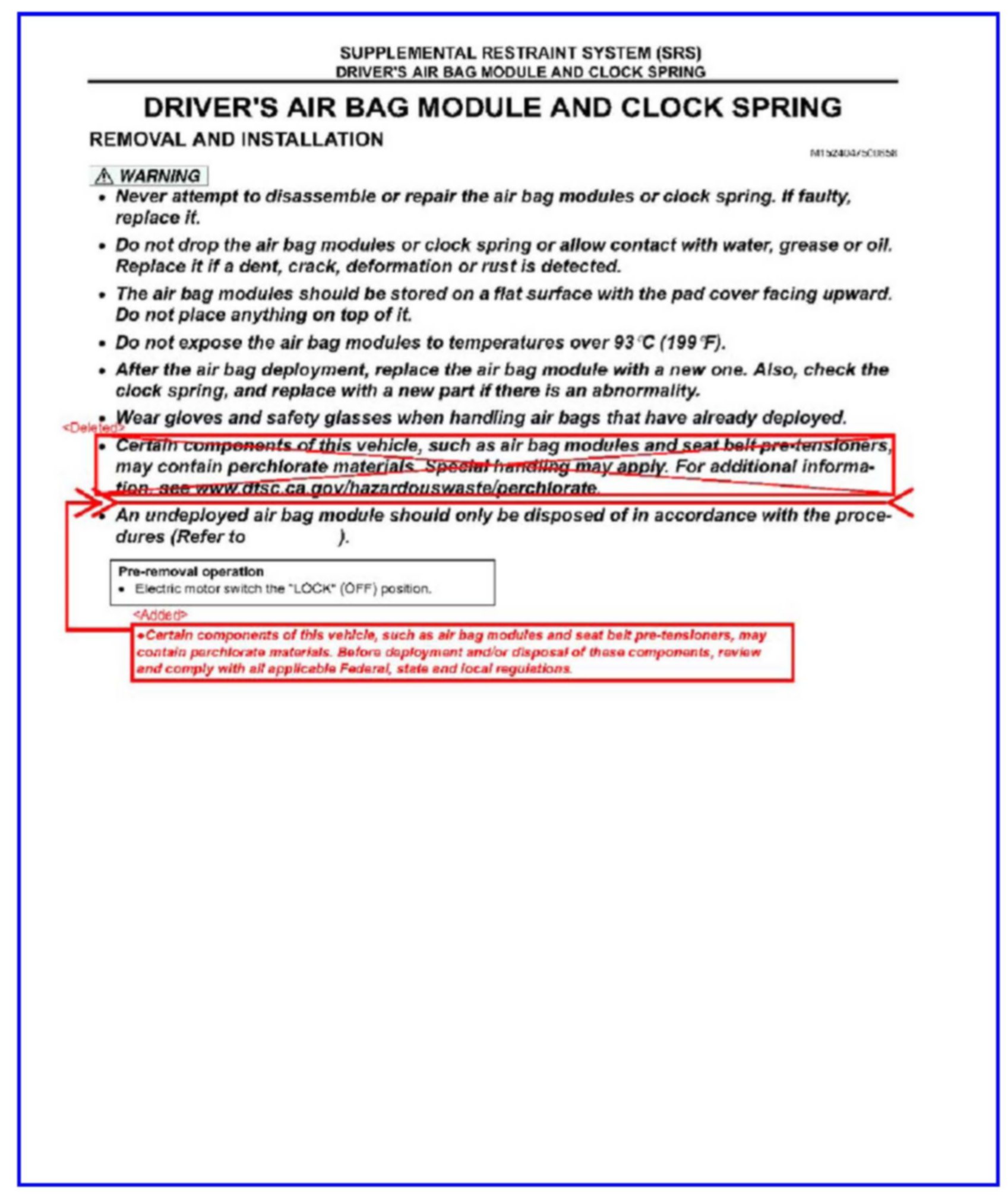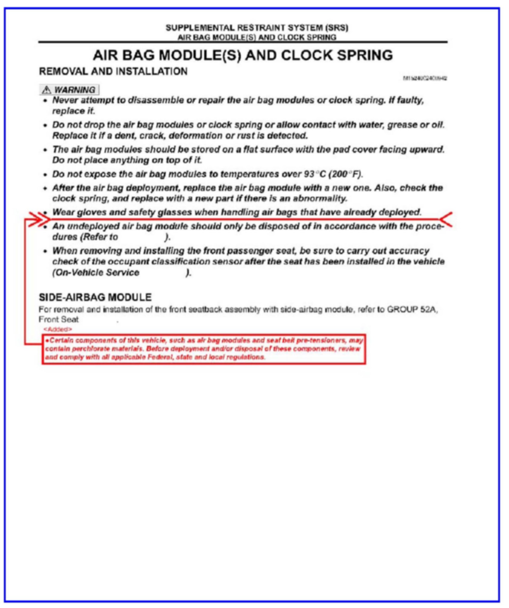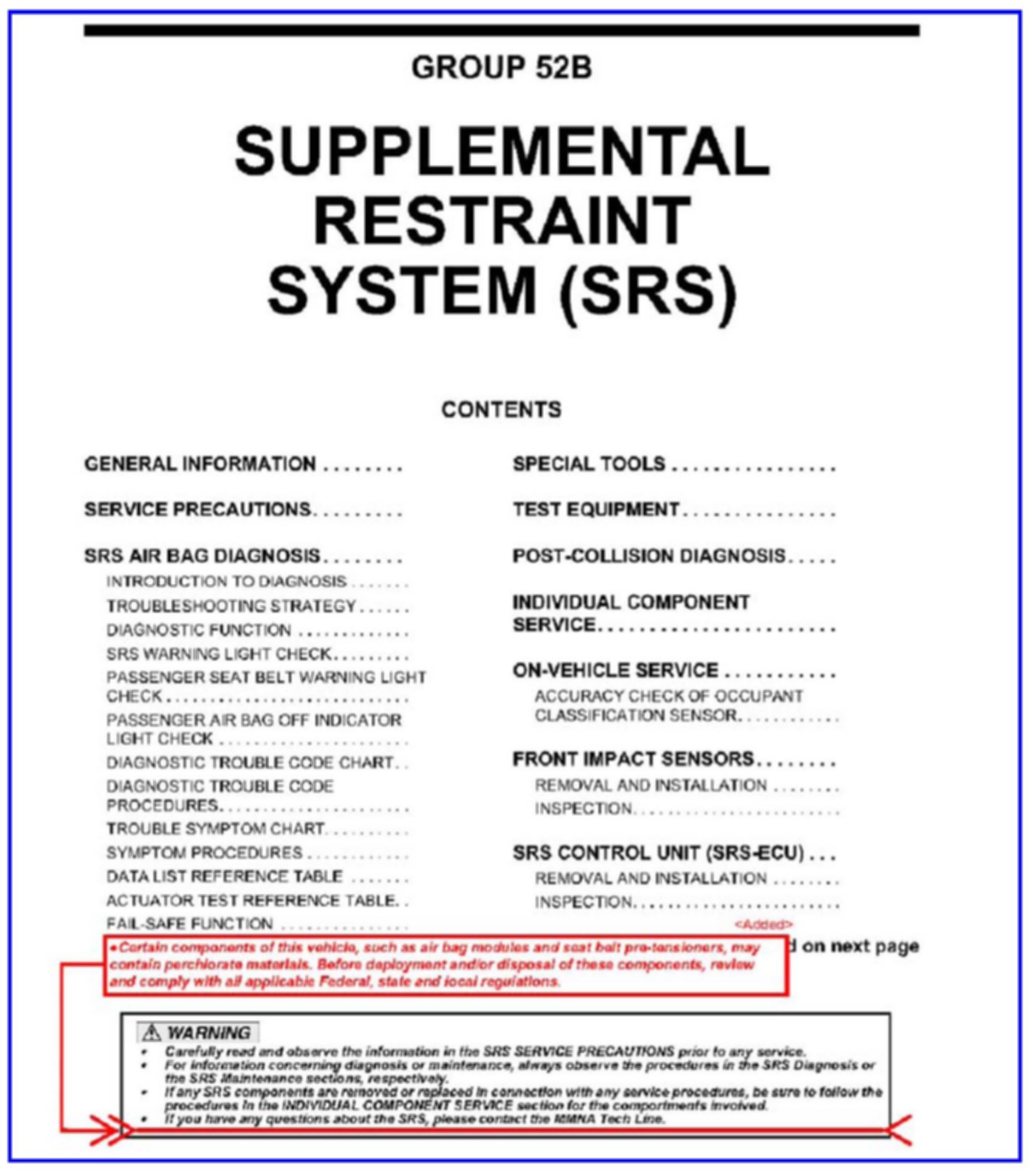 Caution statements regarding the disposal of certain SRS components have been incorrect in the service manuals of affected vehicles. This TSB provides updated caution statements.