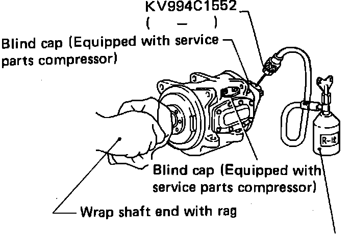 2. To remove the seal seat, apply pressure with refrigerant. Apply refrigerant pressure of 196 to 490 kPa (2 to 5 kg/sq.cm, 28 to 71 psi) through low pressure line of compressor until shaft seal seat is received at rag. Fig. 6