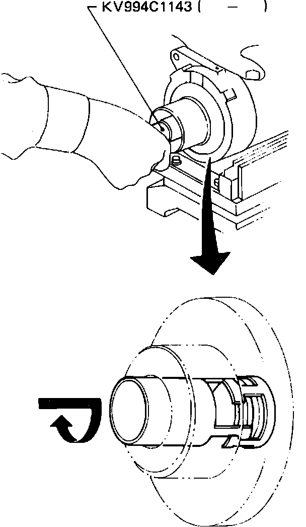 3. With Tool KV994C1143, depress carbon seal and hook the case of shaft seal. Fig. 7