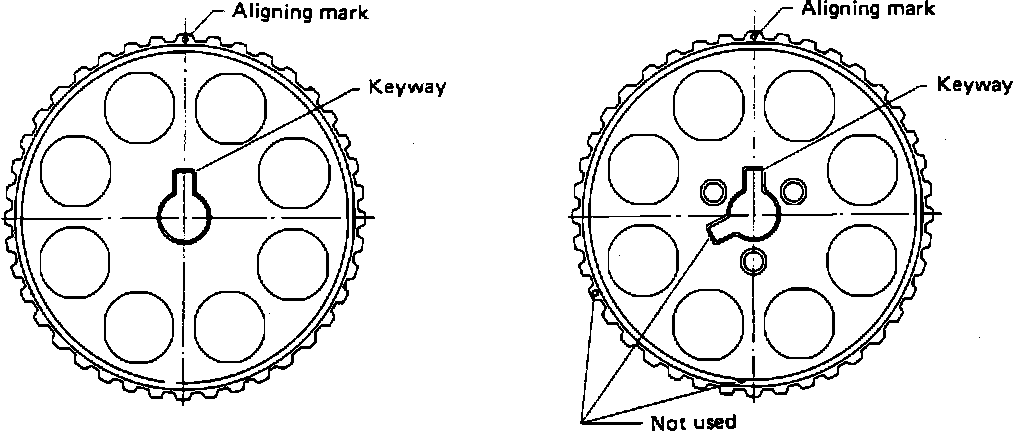 Caution: Incorrect removal or installation of the timing belt can result in damage to internal engine components.Cam Gear Timing Mark Locations (Two Possible Styles):