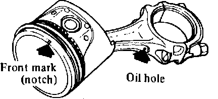 10. Insert pistons in corresponding cylinder. Install so that notch mark on piston head faces to front of engine, Fig. 14.