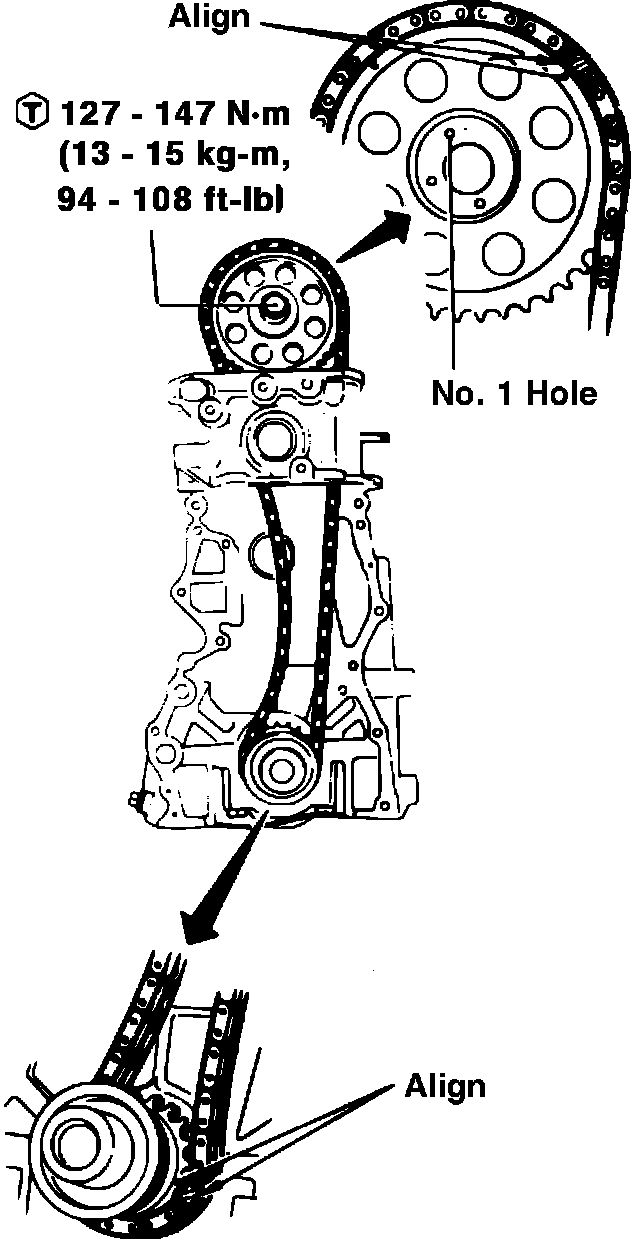 13. Make sure that both valves on No. 1 cylinder are closed, and that camshaft sprocket is correctly indexed. Install cylinder head. Do not rotate crankshaft and camshaft independently after cylinder head installation, or valves will contact pistons.