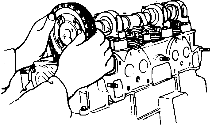24. Remove camshaft sprocket, Fig. 4, and slowly lower timing chain. Before removing camshaft sprocket be sure to mark position of camshaft dowel pin in camshaft sprocket. This step is extremely important to insure proper installation of timing chain during assembly.