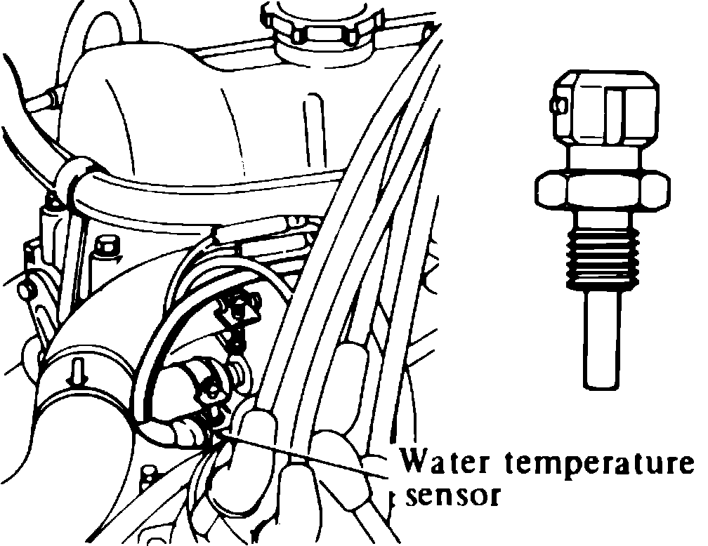 The water temperature sensor, incorporated into the thermostat housing, Fig. 12, monitors change in cooling water temperature and transmits a signal for the fuel enrichment to change the pulse duration during warm-up.