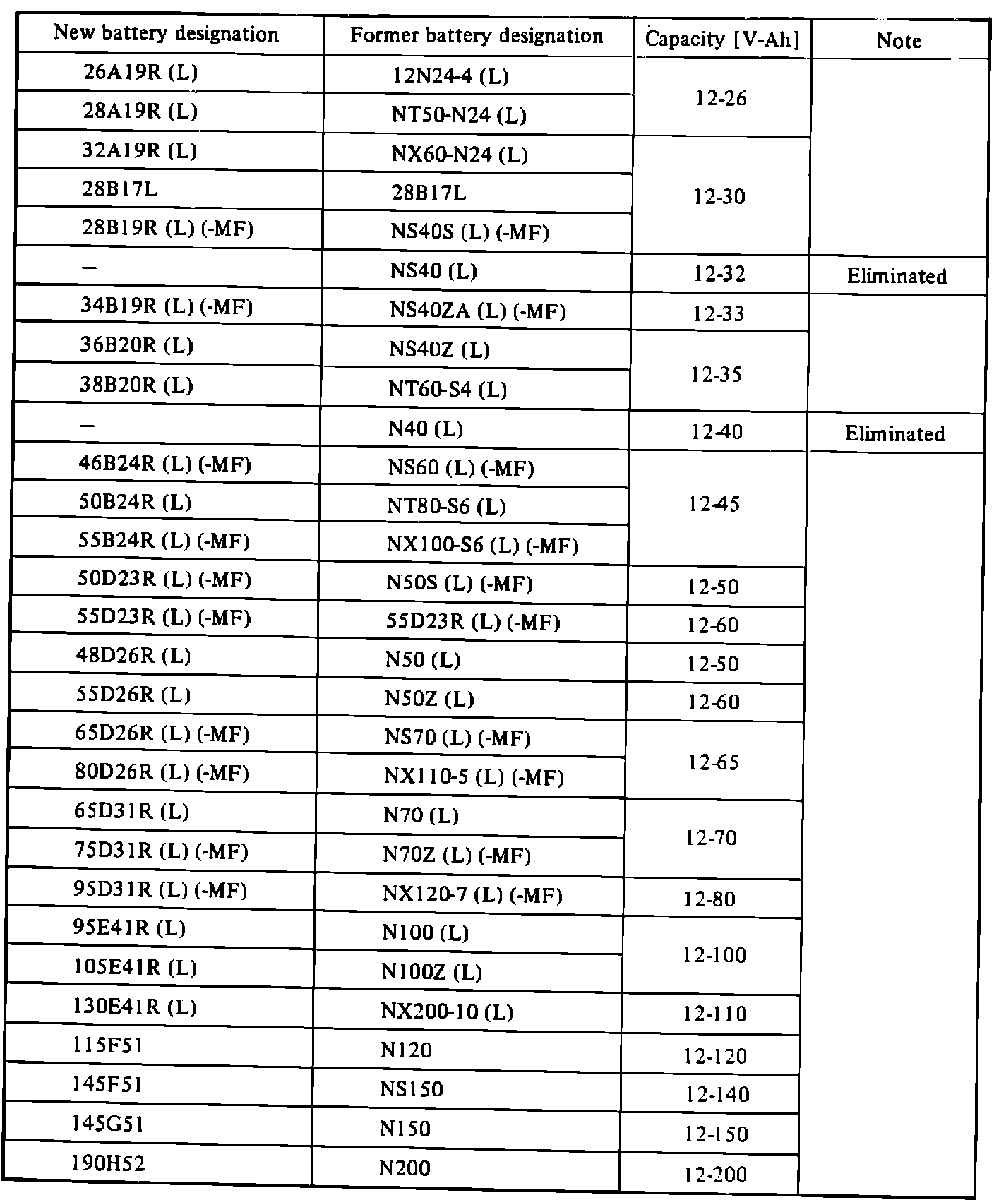 Battery designations for Nissan models have been changed. However, the performance and size of the batteries remain the same. For your reference, an explanation of battery designations is shown below, and a cross reference chart of old and new designations is found on page EE-20.
