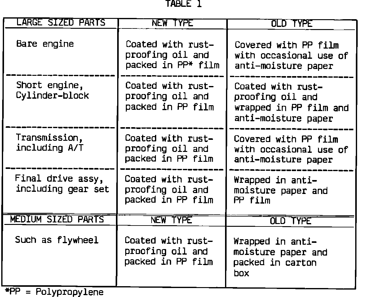 The factory has begun to apply a new rust-proofing material to large and medium sized service parts. This new type of rust-proofing oil must be removed (see below) before installing the parts to a vehicle. Table 1 lists the applied parts with the new and old type of rust-proofing material used.