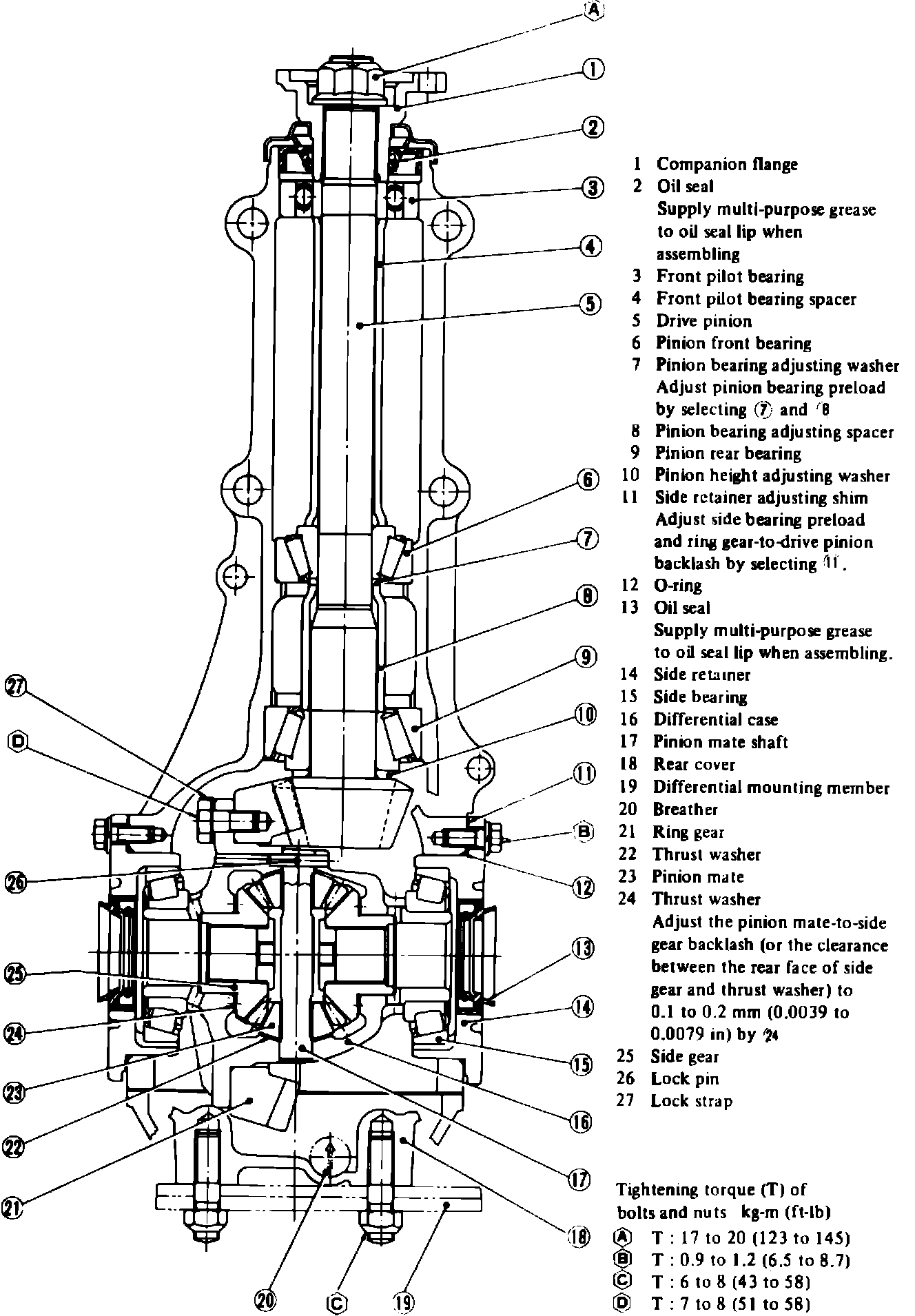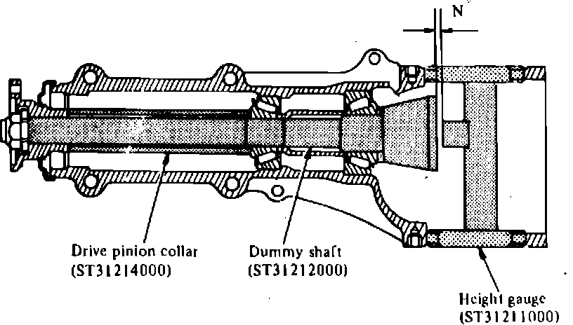 3. The thickness of drive pinion height adjusting washer can be obtained from the following formula: T= W + N - ((H - D' - S) 0.01 - 0.20 where T = required thickness of rear bearing adjusting washers in millimeters, W = thickness of washers temporarily inserted in millimeters, N = measured value with thickness gauge in millimeters, H = figure marked on the drive pinion head, D' = figure marked on the dummy shaft, S = figure marked on the height gauge and figures for H, D' and S are dimensional variations in a unit 1/100 mm against each standard measurement. If values signifying H, D' and S are not given, regard them as zero and compute.
