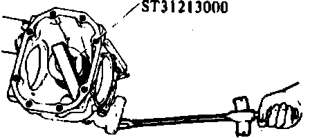 3. Install drive pinion bearing spacer, washer, front bearing cone, Drive Pinion Dummy Collar ST31214000 and companion flange on dummy shaft and tighten drive pinion nut using Stopper ST31852000, Fig. 4. Measure pinion bearing preload using Preload Gauge ST3127S000, and select washer and spacer that will provide required preload, Fig. 5.