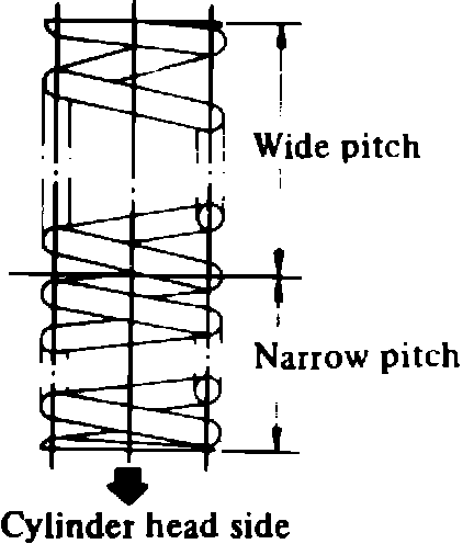 2. Apply clean engine oil to valve stem and lip of valve seal, then install valve and valve components. Install valve spring with narrow pitch side toward cylinder head side, Fig. 10.