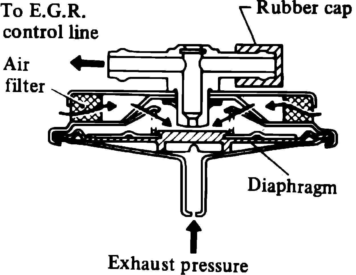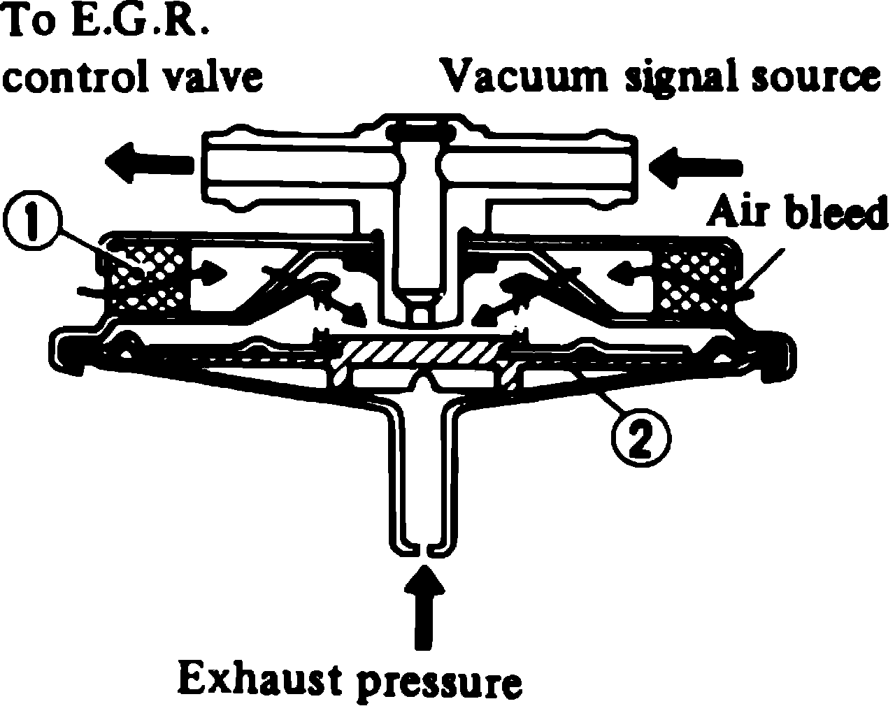 This valve, Figs. 14 and 15, monitors exhaust pressures to activate the diaphragm. The valve controls vacuum applied to the EGR control valve. This allows the operation of the EGR control valve to be controlled by engine operating conditions.