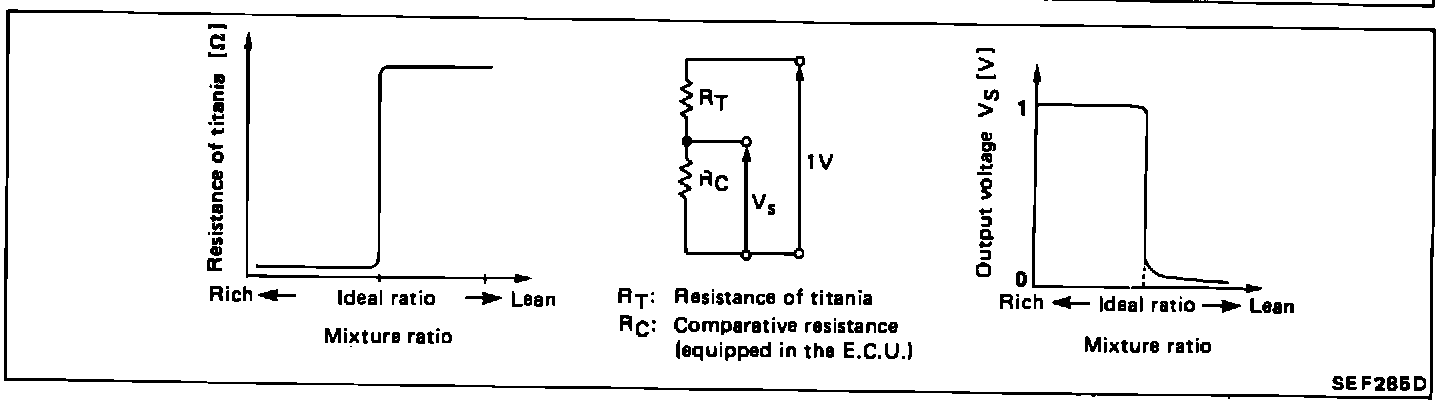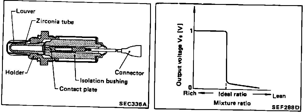 I. ZIRCONIA TYPE EXHAUST GAS SENSOR The exhaust gas sensor, which is placed into the exhaust manifold, monitors the mount of oxygen in the exhaust gas. The sensor has a closed-end tube made of ceramic zirconia. The outer surface of the tube is exposed to exhaust gas, and the inner surface to atmosphere. The zirconia of the tube compares the oxygen density of exhaust gas with that of atmosphere, and generates electricity. In order to improve generating power of the zirconia, its tube is coated with platinum. The voltage is approximately 1V when the mixture ratio is richer than the ideal air-fuel ratio, and approximately OV when leaner. The radical change from 1V to OV occurs near the ideal mixture ratio. In this way, the exhaust gas sensor detects the amount of oxygen in the exhaust gas and sends the signal of approximately 1V or OV to the E.C.U. On 1984-1985 300ZX and 1985-1986 Maxima models, with VG30 engines a ceramic heater was employed to ensure the stable performance of the sensor.