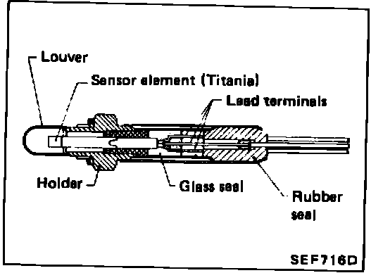 II. TITANIA TYPE EXHAUST GAS SENSOR The exhaust gas sensor, located in the exhaust tube, monitors the amount of oxygen in the exhaust gas. This sensor is made of ceramic titania that is drastically changed by electrical resistance at the ideal air-fuel ratio. The E.C.U. supplies the sensor with approximately 1V and reads the sensor output voltage, depending on its resistance. In order to activate the sensor element, it is equipped with a heater.