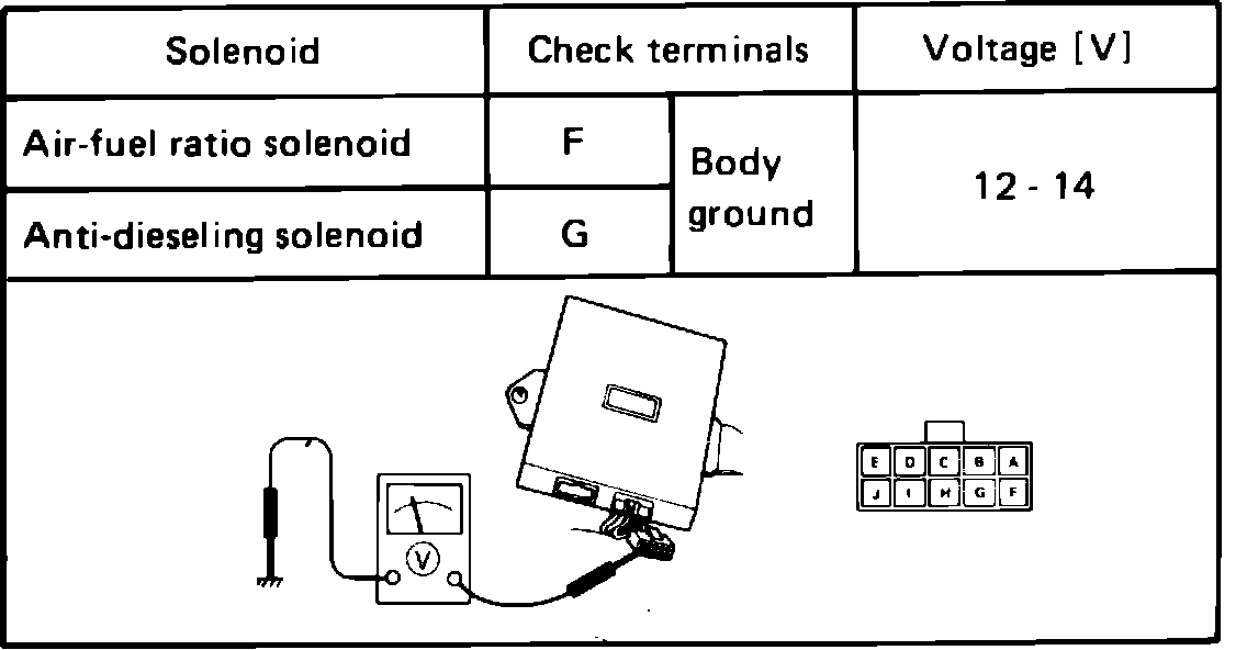 b. Disconnect electrical connectors from air/fuel ratio solenoid and anti-dieseling solenoid.
