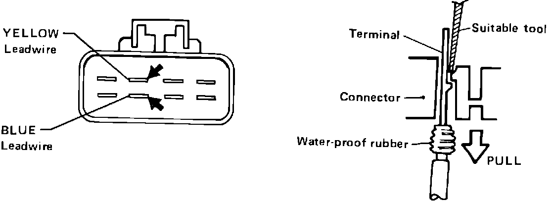 (b) Remove the two richer solenoid terminals from the carburetor connector by inserting a narrow tipped screwdriver or similar tool next to the terminal. Push the locking pin away from the terminal and remove the terminal through the back of the connector.