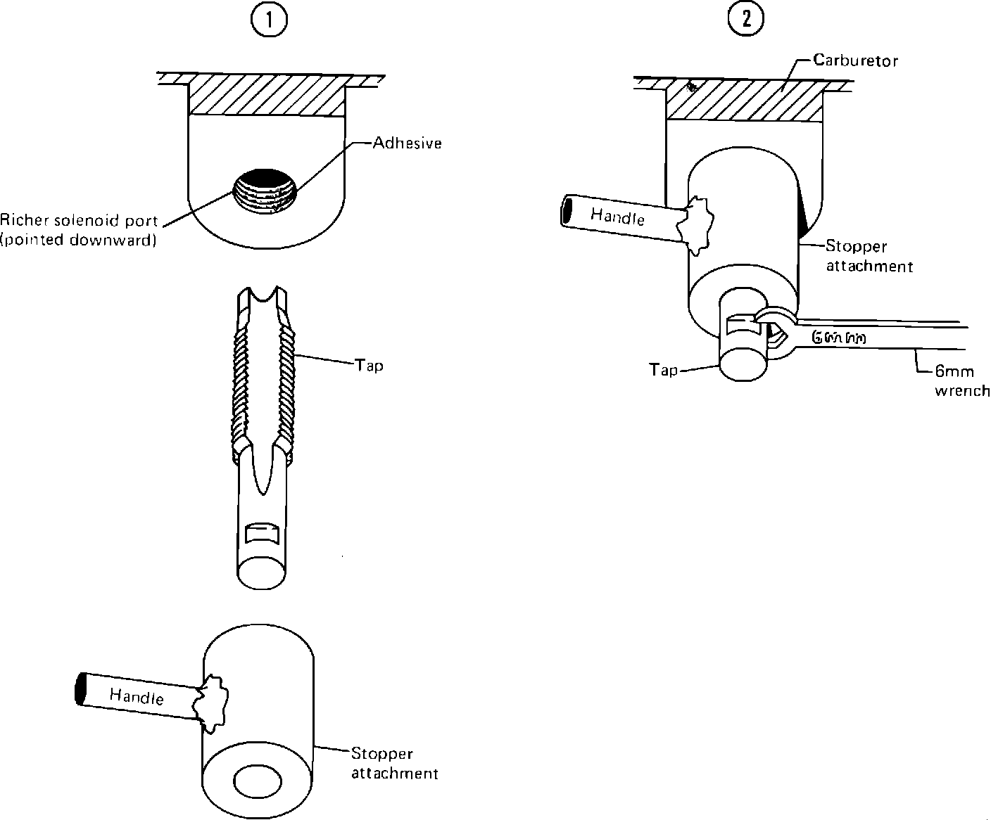 13. While holding the carburetor with the richer solenoid port pointed downward, use the special tools to clean the adhesive from the port threads (see below).