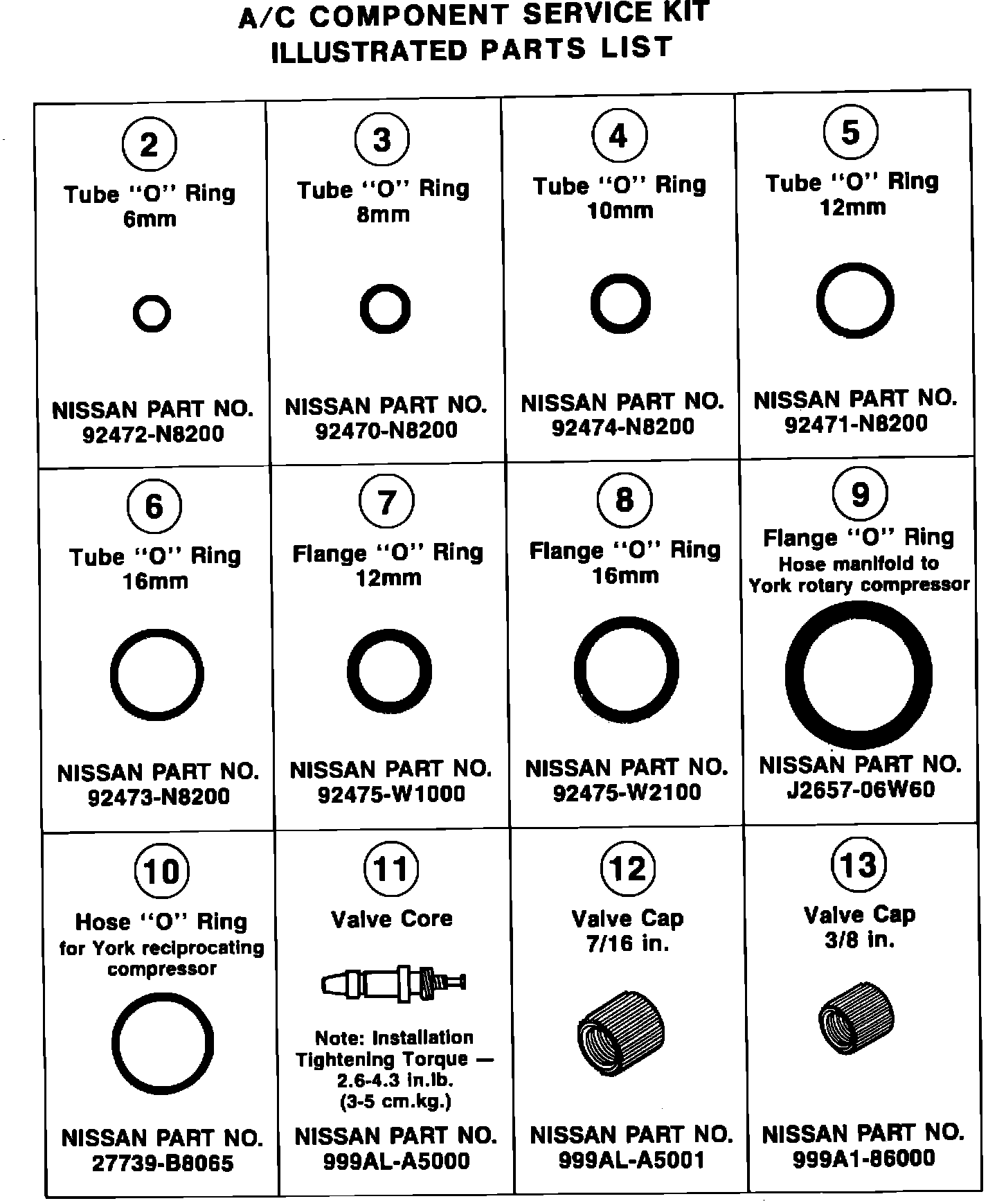 Nissan Air Conditioner Component Service Kit, P/N 999A1-A6000, is now available for use on 1981-1987 Nissan model air conditioning systems. This compact kit contains many of the routine air conditioner replacement parts (i.e. O-rings, valve cores, valve caps) regularly used to repair or rebuild various A/C components.