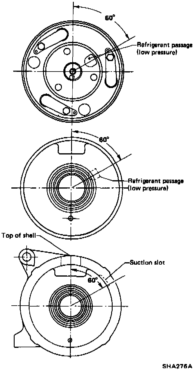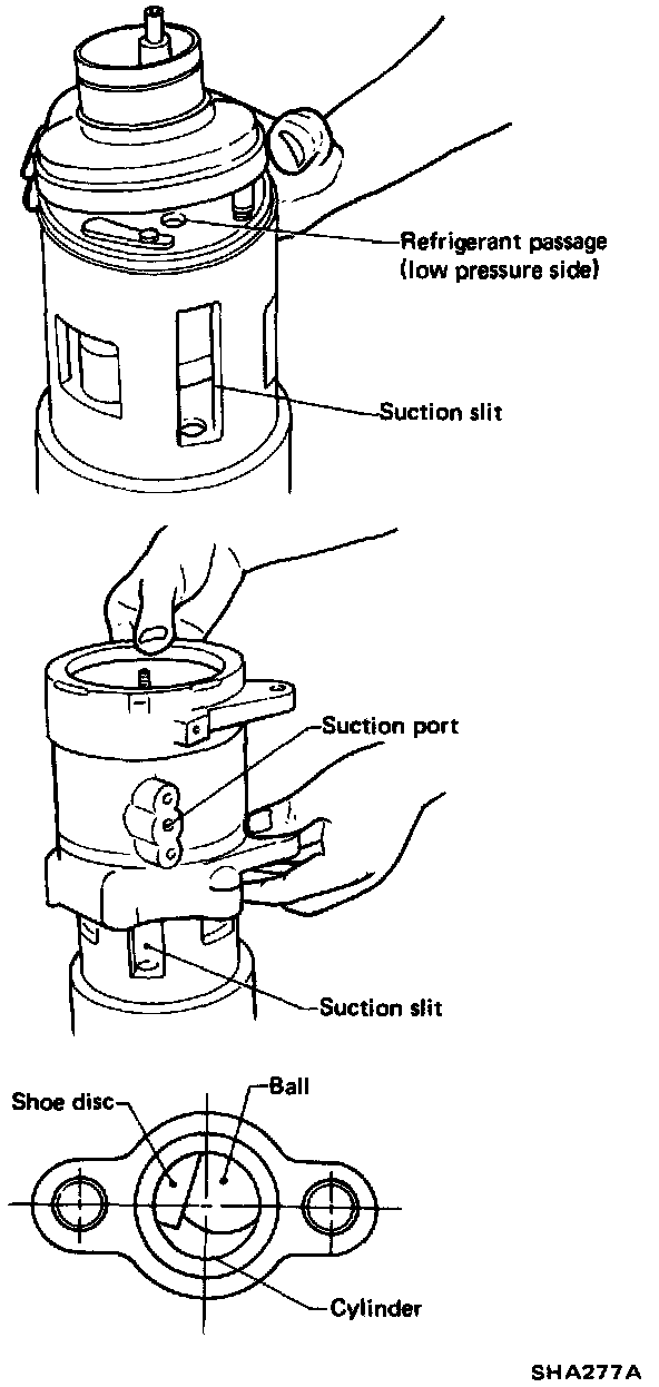 2) When installing shell on cylinder, adjust position of shell so that suction inlet of shell opens in the same direction as suction slot of cylinder assembly. Then, make sure swash plate is visible in suction inlet by removing suction valve.