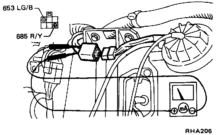 1. After disconnecting sunload sensor amp. connector, ensure that there is current between terminals 685 and 653 on vehicle harness side.
