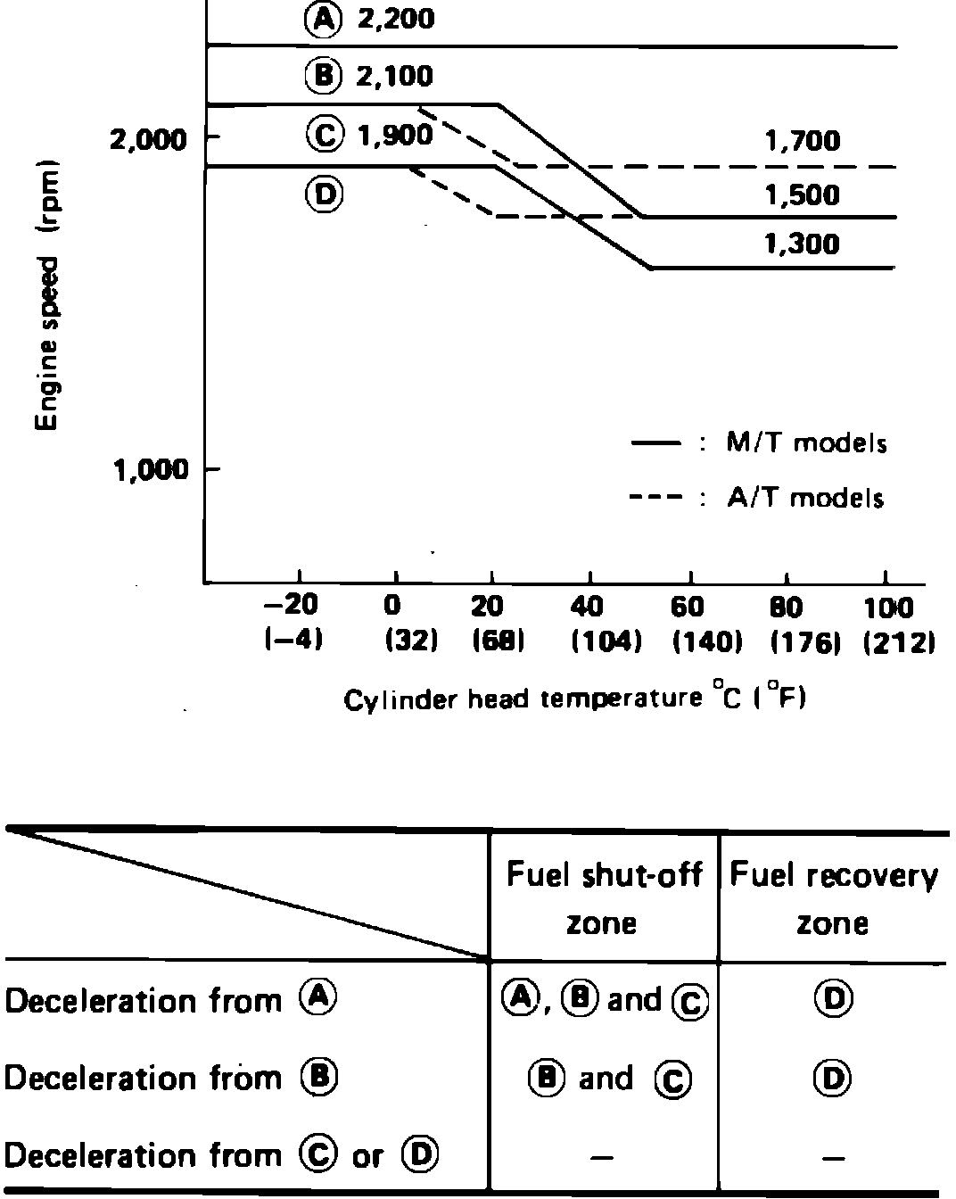 The fuel cut specifications for manual and automatic transmission equipped models are shown in Fig. 28.