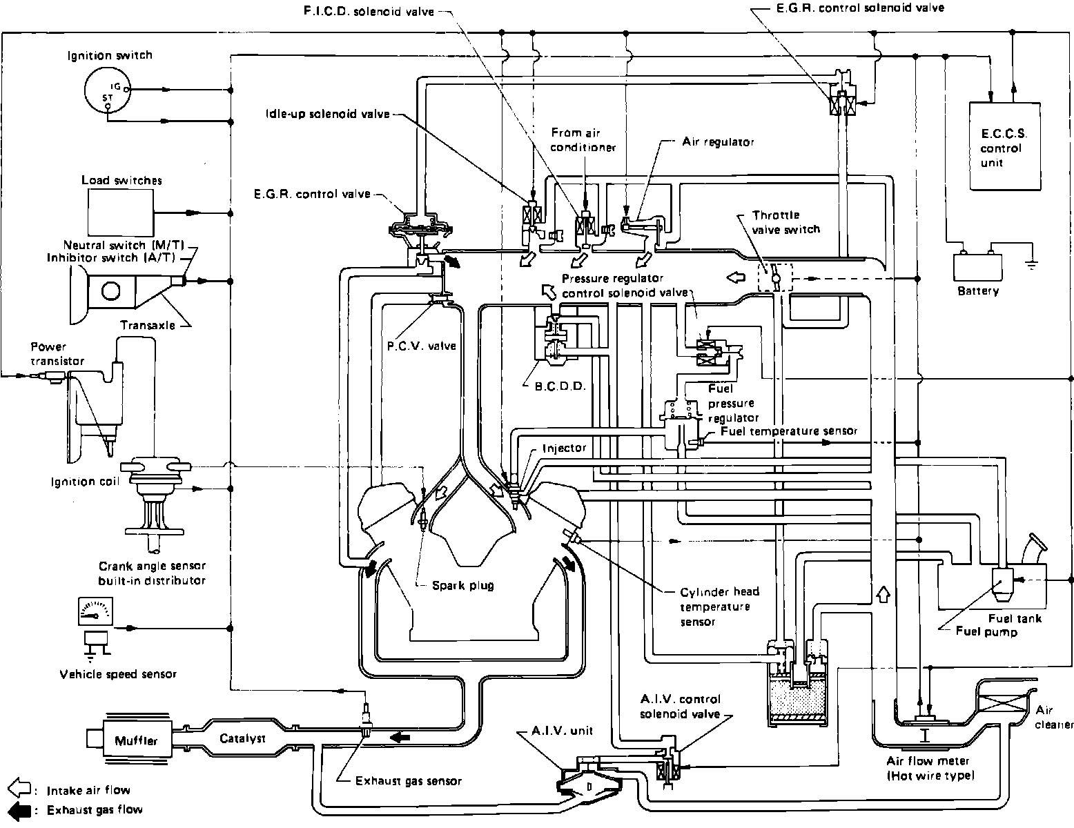 The Electronic Concentrated Engine Control System (ECCS), incorporates Bosch L-Jetronic Fuel Injection (EFI) and employs a micro-computer within the control unit. This micro-computer controls fuel injection, spark timing, exhaust gas recirculation (EGR), idle speed, fuel pump operation, air controls, and mixture ratio feedback. The micro-computer processes incoming signal data from engine and vehicle sensors and computes signal combinations to be sent to the electrical actuators.
