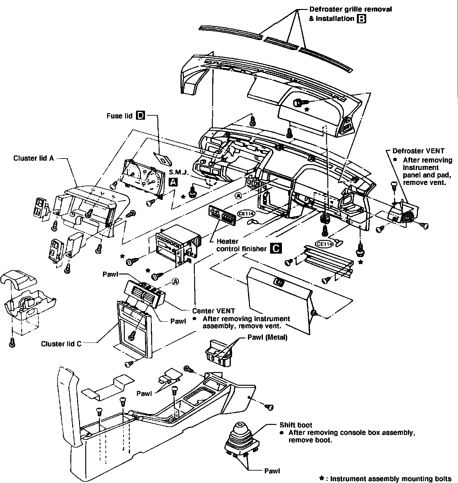 Fig. 10 Exploded view of instrument panel. 1987-88 Pulsar: