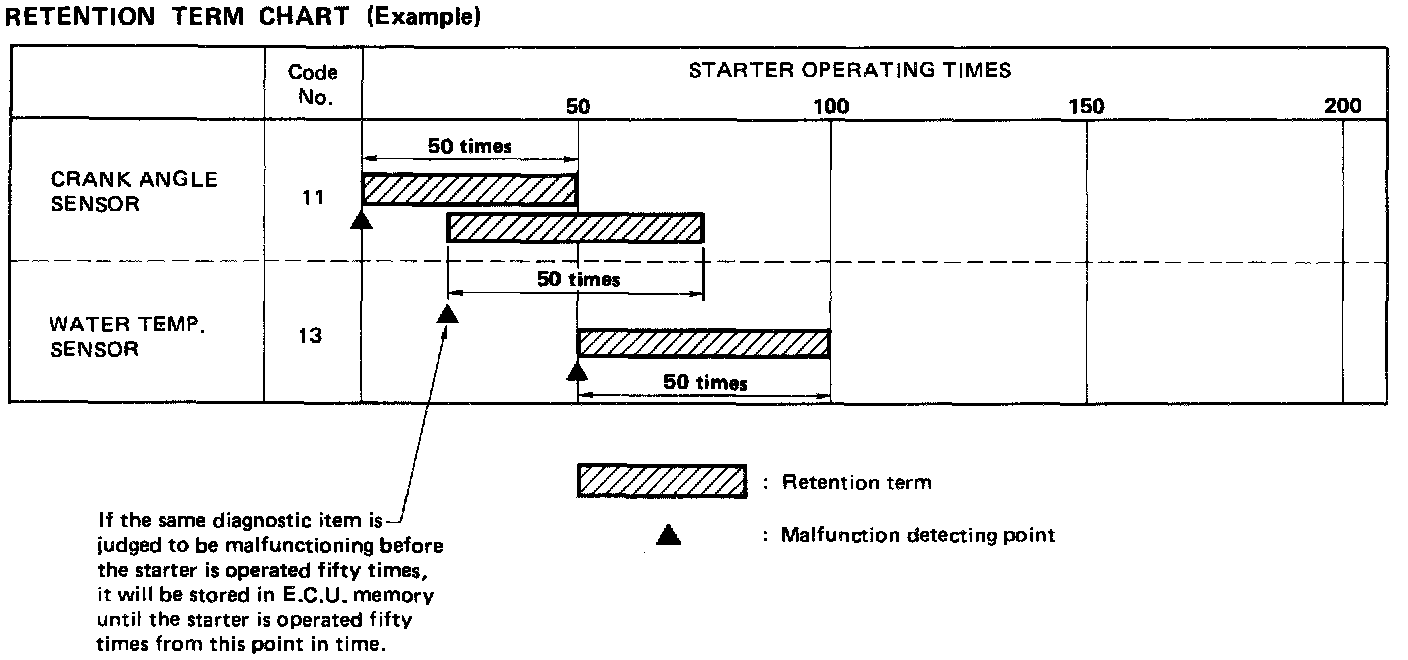 The diagnostic result is retained in E.C.U. memory until the starter is operated fifty times after a diagnostic item is judged to be malfunctioning. The diagnostic result will then be cancelled automatically. If a diagnostic item which has been judged to be malfunctioning and stored in memory is again judged to be malfunctioning before the starter is operated fifty times, the second result will replace the previous one. It will be stored in E.C.U. memory until the starter is operated fifty times more.