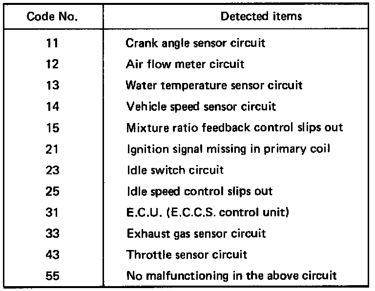 The E.C.U. constantly monitors the function of these sensors and actuators, regardless of ignition key position. If a malfunction occurs, the information is stored in the E.C.U. and can be retrieved from the memory by turning on the diagnostic mode selector, located on the side of the E.C.U. When activated, the malfunction is indicated by flashing a red and a green L.E.D. (Light Emitting Diode), also located on the E.C.U. Since all the self-diagnostic results are stored in the E.C.U.'s memory even intermittent malfunctions can be diagnosed.A malfunctioning part's group is indicated by the number of both the red and the green L.E.D.s flashing. First, the red L.E.D. flashes and the green flashes follow. The red L.E.D. refers to the number of tens while the green one refers to the number of units. For example, when the red L.E.D. flashes once and then the green one flashes twice, this means the number "12" showing the air flow meter signal is malfunctioning. In this way, all the problems are classified by the code numbers.