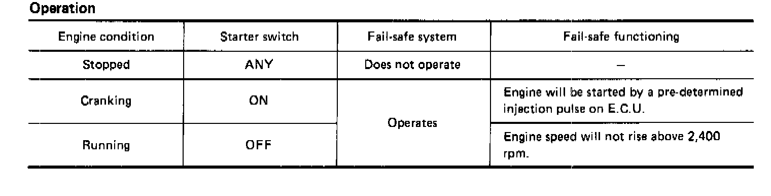 Though air flow meter is malfunctioning, it is possible to drive the vehicle and start the engine. But engine speed will not rise more than 2,400 rpm in order to inform the driver of fail-safe system operation while driving.