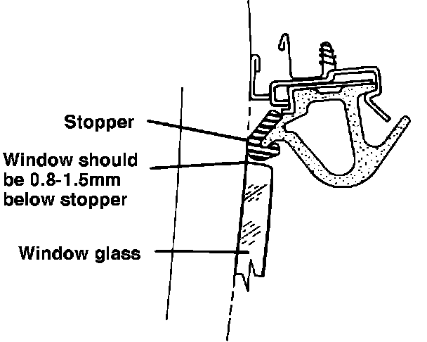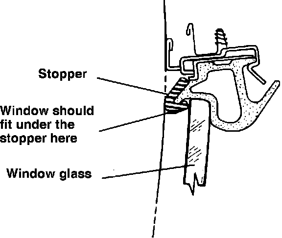 Before adjusting the window, make sure that the window glass stopper has not been bent down due to the window hitting the outside of the stopper. If the stopper is bent down, it can be bent back up by hand so that the top of the stopper is contacting the outer edge of the T-top.