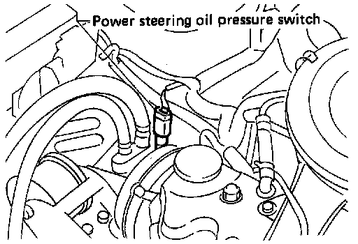The power steering oil pressure switch is attached to the power steering high pressure tube and detects the power steering load, sending the load signal to the E.C.U. The E.C.U. then sends the idle-up signal to the I.S.C. valve.