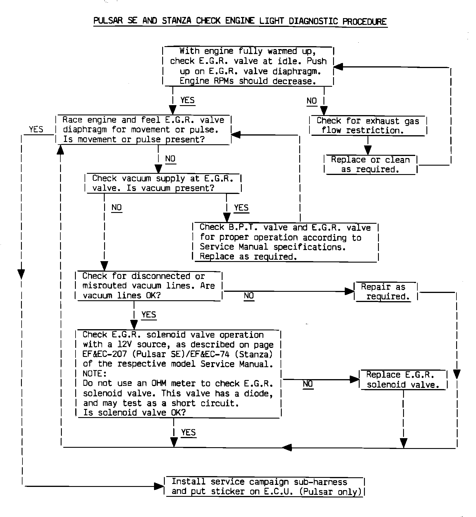 1. Observe the "check engine" light while the engine is running. If the light is off, stop the engine and install the appropriate sub-harness (supplied by the customer), using the modification procedure on page 4/7 (Pulsar SE) or 5/7 (Stanza) of this Technical Bulletin.