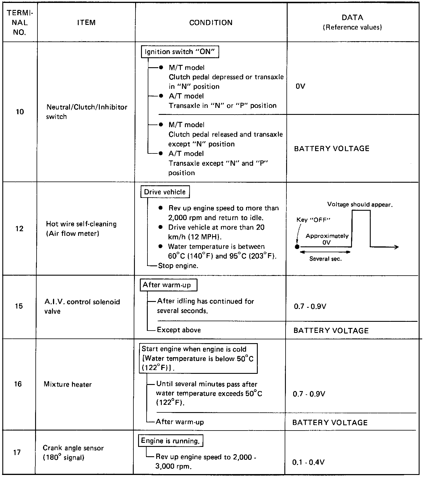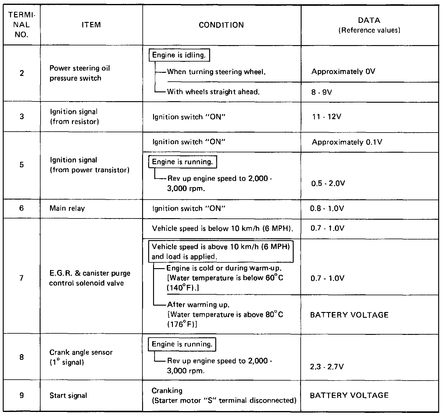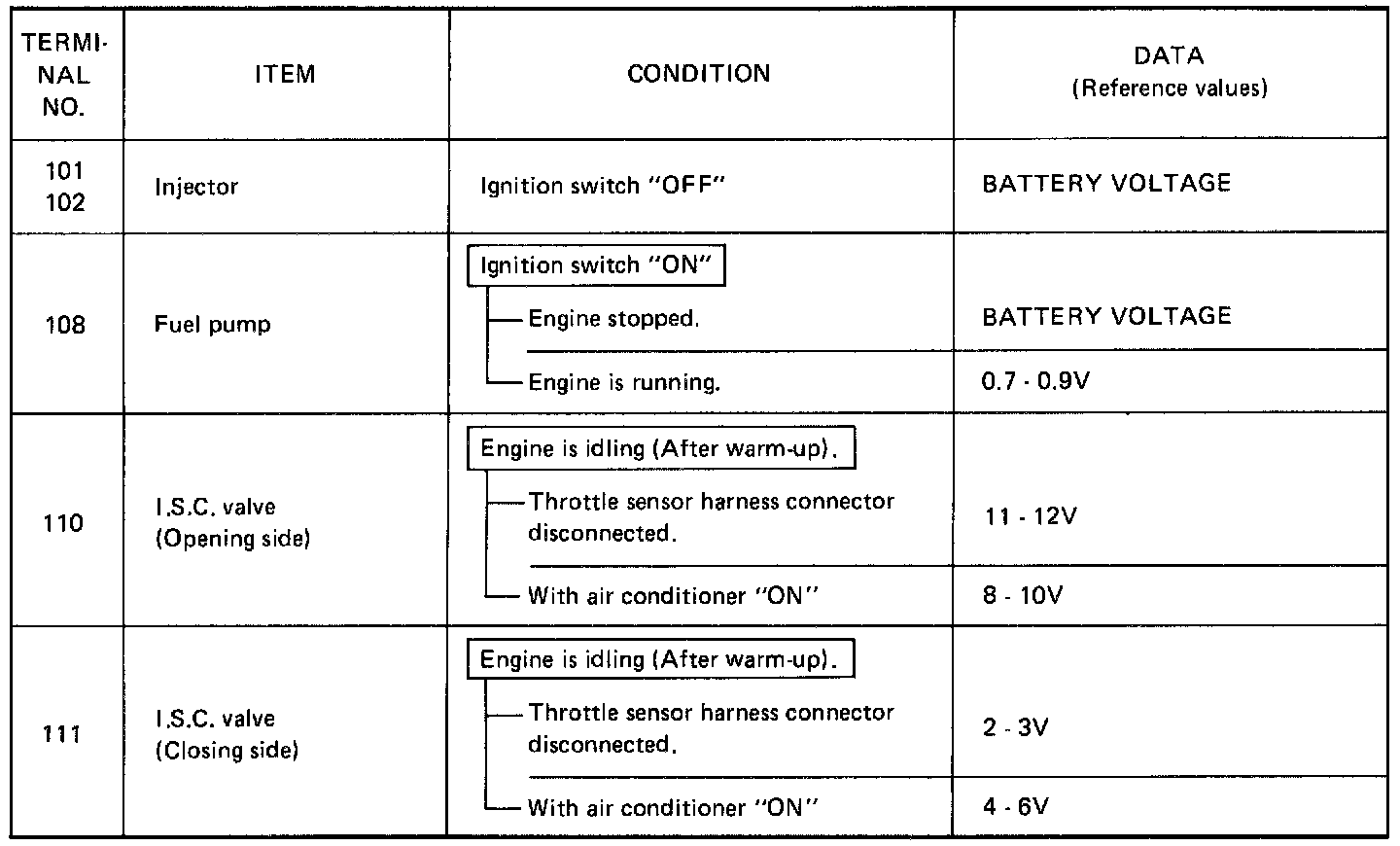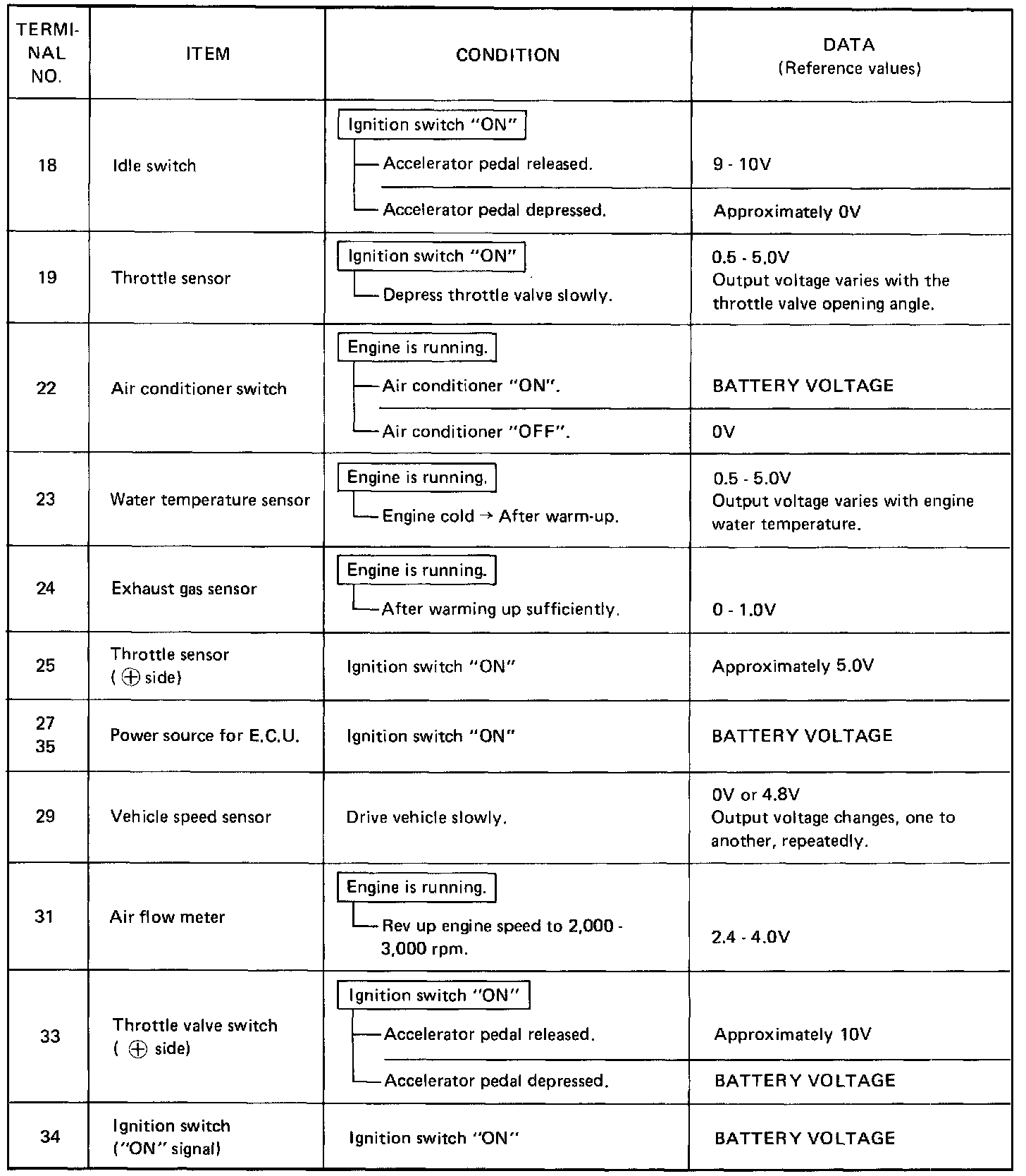 7. Measure the voltage at each terminal by following "E.C.U. Inspection Table" below.