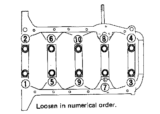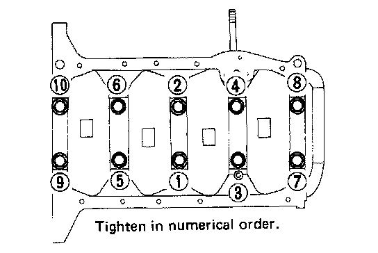 Tighten all bolts in correct order and in two or three stages. 49-59N.m (5.0-6.0 kg-m, 36-43 ft-lb).