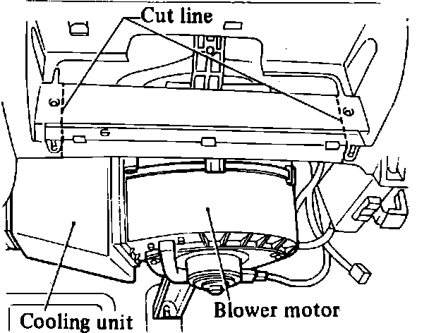 5. Using hacksaw blade, cut instrument panel on cut lines, Figs. 16 and 17. Cover blower motor vent holes with tape before cutting and brush shavings away from area around blower motor and remove tape after cutting.