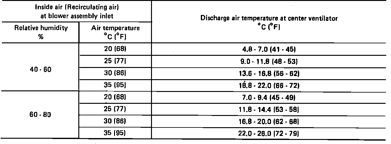 Fig. 40 A/C system performance test (recirculating-to-discharge air temperature).: