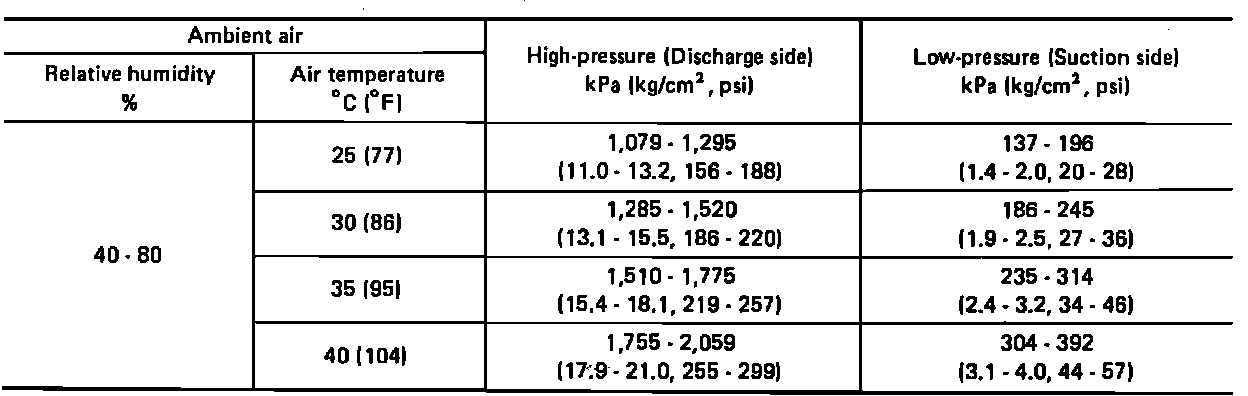 Fig. 41 A/C system performance test (ambient air temperature-to-compressor pressure).: