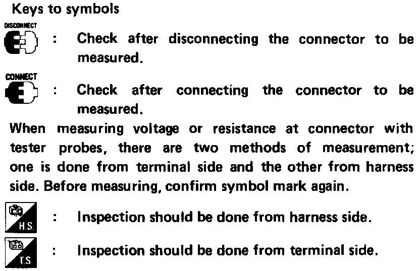 7. When measuring supply voltage of E.C.U. controlled components with a circuit tester, separate one tester probe from the other.