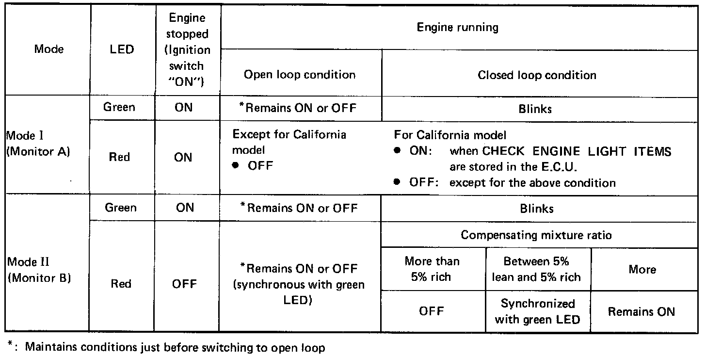 In these modes, the control unit provides the Air-fuel ratio monitor presentation and the Air-fuel ratio feedback coefficient monitor presentation.