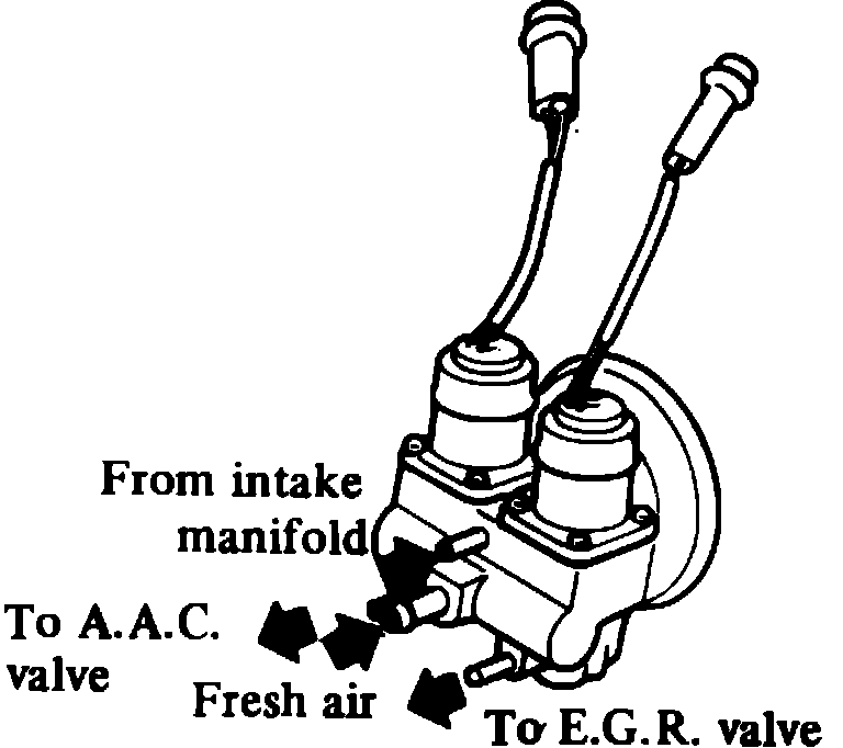 The vacuum control modulator is composed of a pressure regulator and solenoid valve. Intake manifold vacuum is used as the vacuum source for the pressure regulator. The passage leading to the atmosphere is controlled by solenoid valves. The vacuum control modulator provides vacuum to the EGR valve and AAC valve following the electrical signal from the control unit.