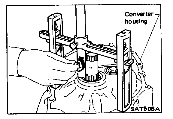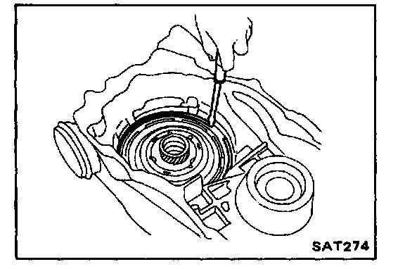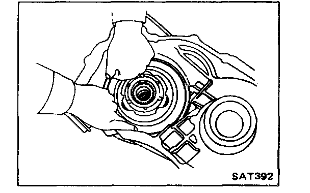 28. Turn parking gear (rear internal gear) clockwise with screw- driver while supporting converter housing assembly by hand, until output shaft splines, front carrier, and rear internal gear are engaged properly.