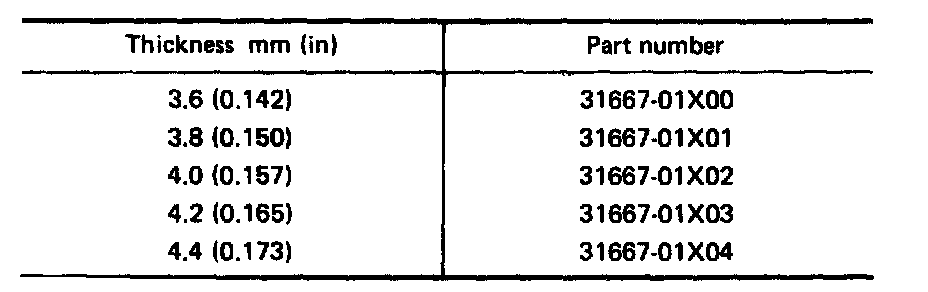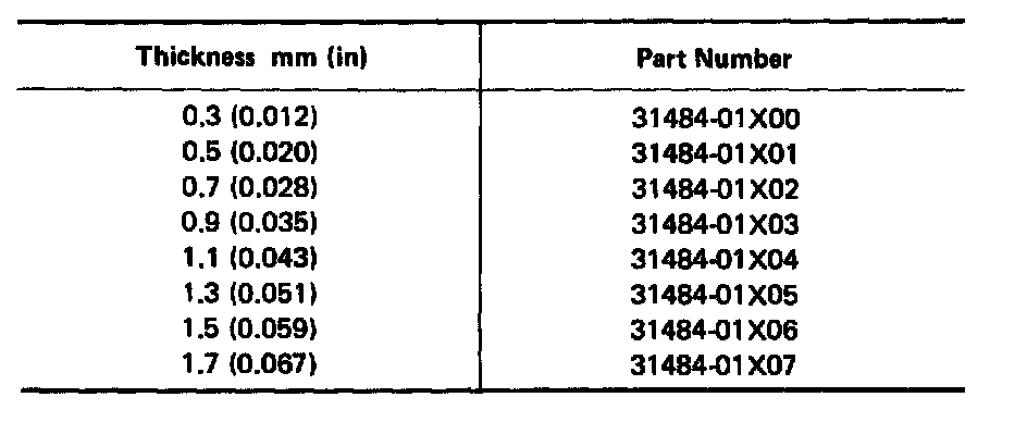 f. Use your feeler gauge measurement and following adjusting shim chart to select correct shim thickness to give you proper output shaft end play.