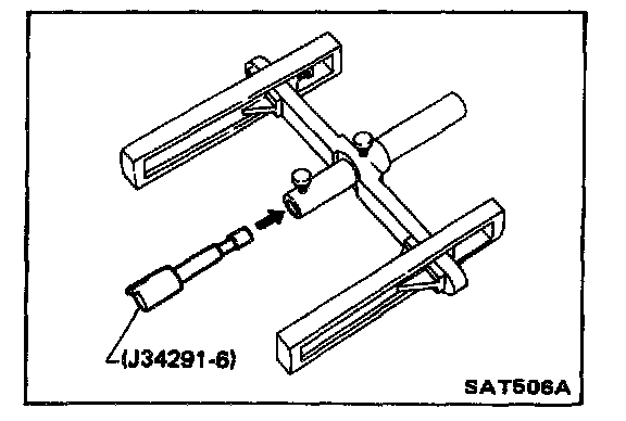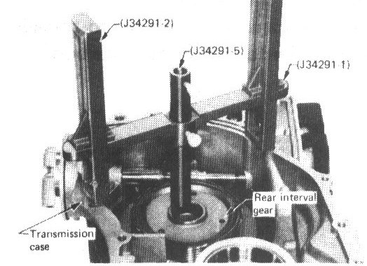 a. Place J 34291-1 (bridge), J 34291-2 (legs) and J 34291-5 (gauging cylinder) on machined surface of transmission case (no gasket). Position bridge legs so the short ends of the legs are down, and adjust legs to fit onto housing properly. Allow gauging cylinder to rest on center machined surface of rear internal gear and lock it in place with thumbscrew.