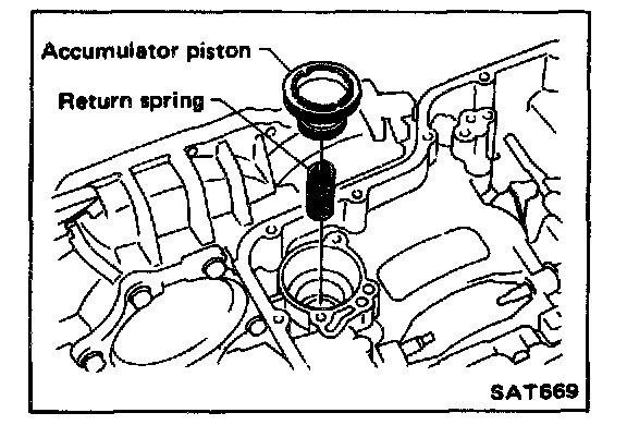 30. Apply vaseline to lathe cut ring, then install return spring and accumulator piston on transmission case.