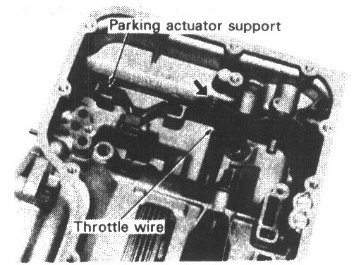 32. Assemble parking actuator support and throttle wire to transmission case.