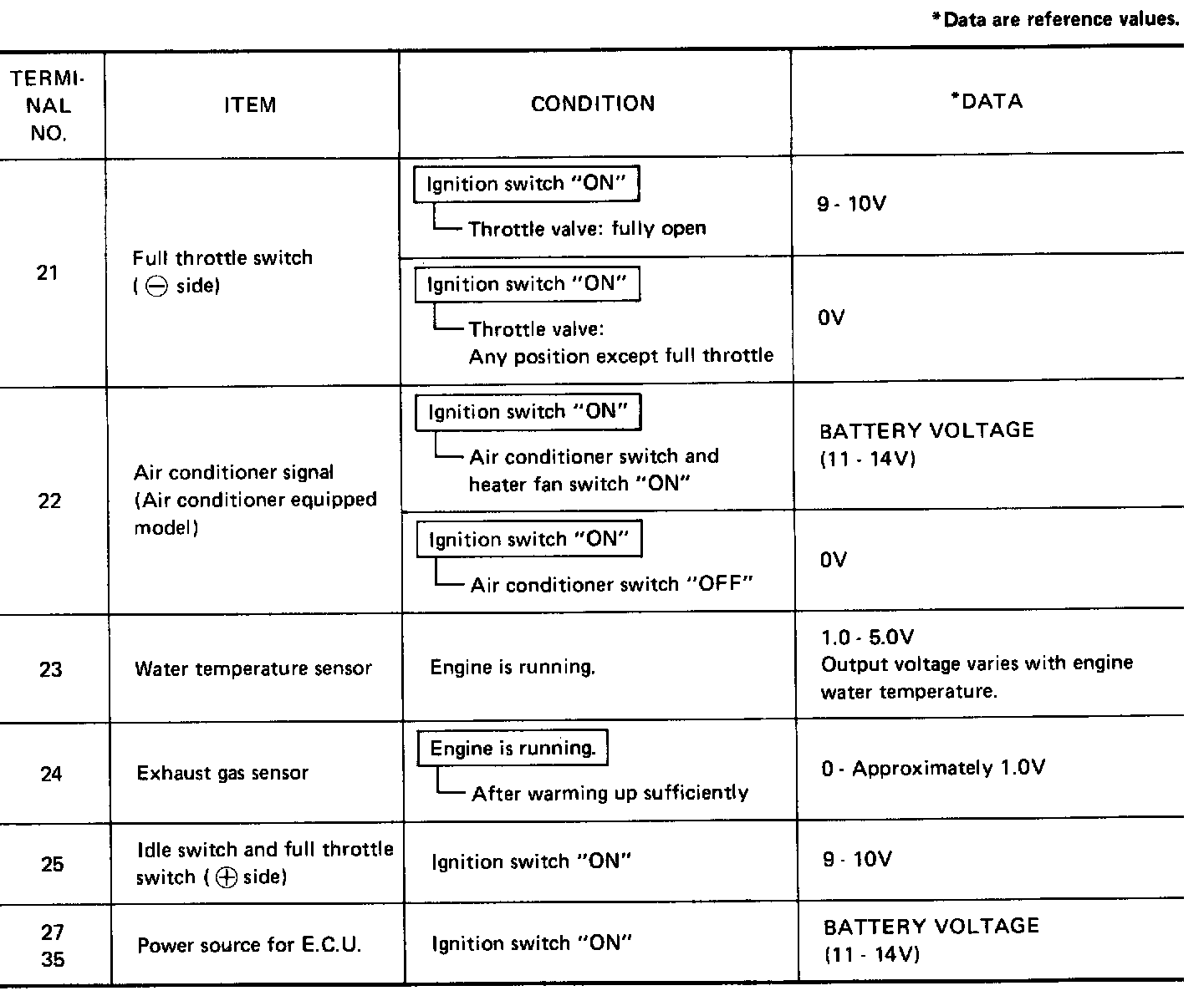 7. Measure the voltage at each terminal by following the "E.C.U. Inspection Table".